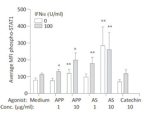 The ensuing responses are driven by activation of the signaling protein and transcription factor STAT1 [pSTAT1]. The presence of OPCs from apples enhanced this response. [APP] OPCs from a different source - a standardized supplement containing acai extract - also did so. [AS]