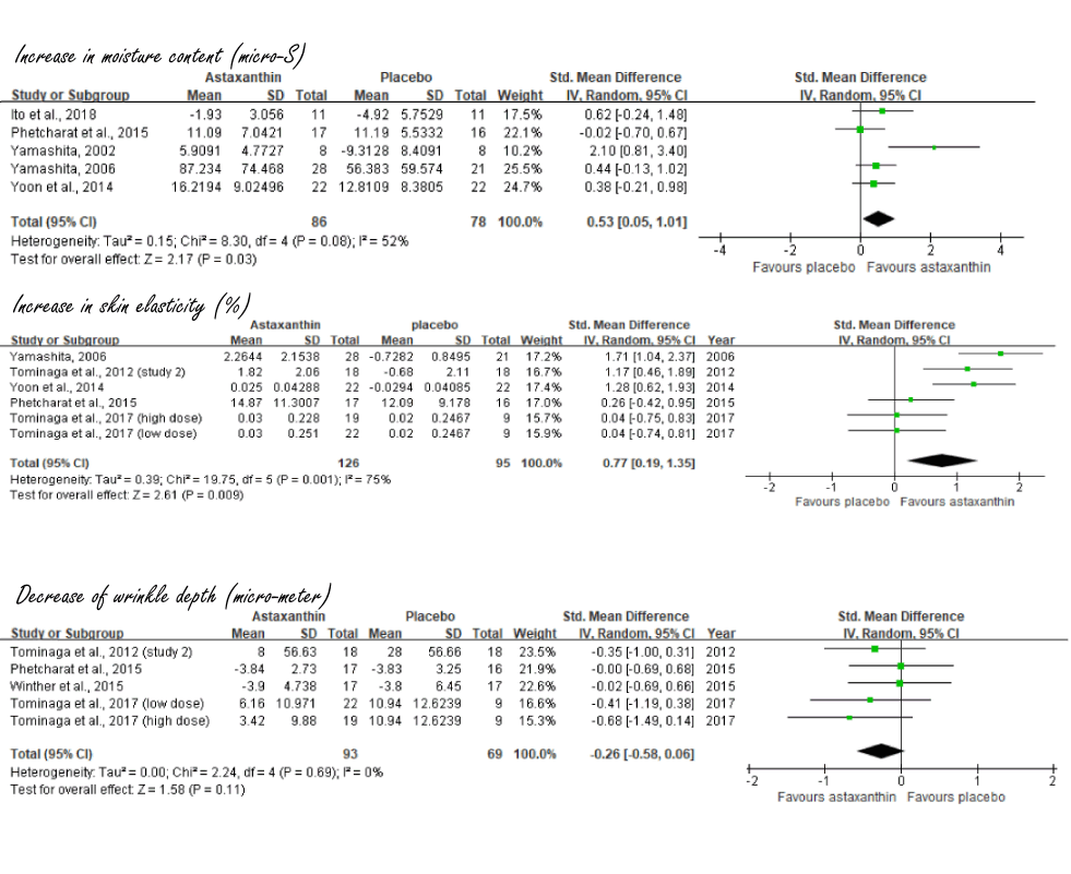 These last two effects are cosmetically and clinically relevant. The dosages at which astaxanthin improved these two parameters were 4-6 milligrams per day. The added value of even higher doses was often unclear.