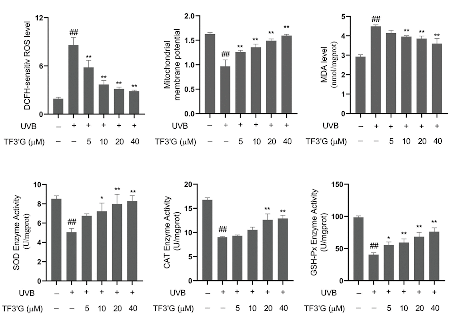 In addition, during UVB exposure, theaflavin-3'-gallate reduces mitochondrial function loss and the activity of protective endogenous enzymes such as catalase and SOD.