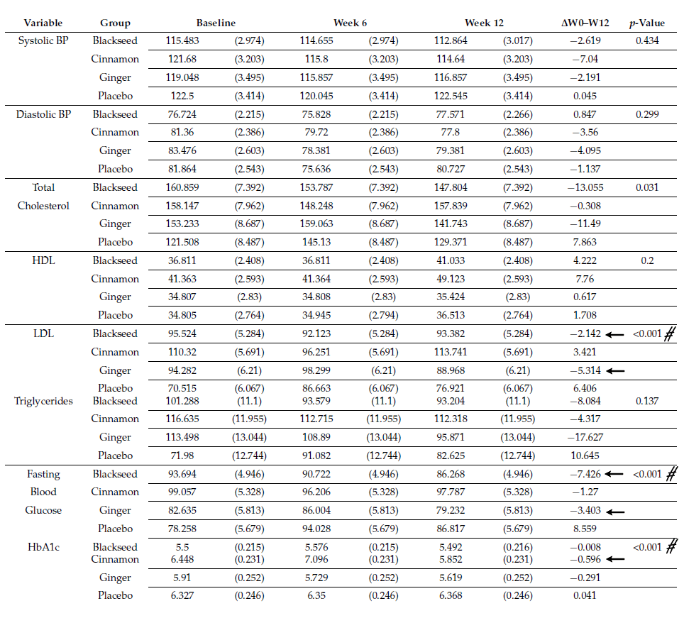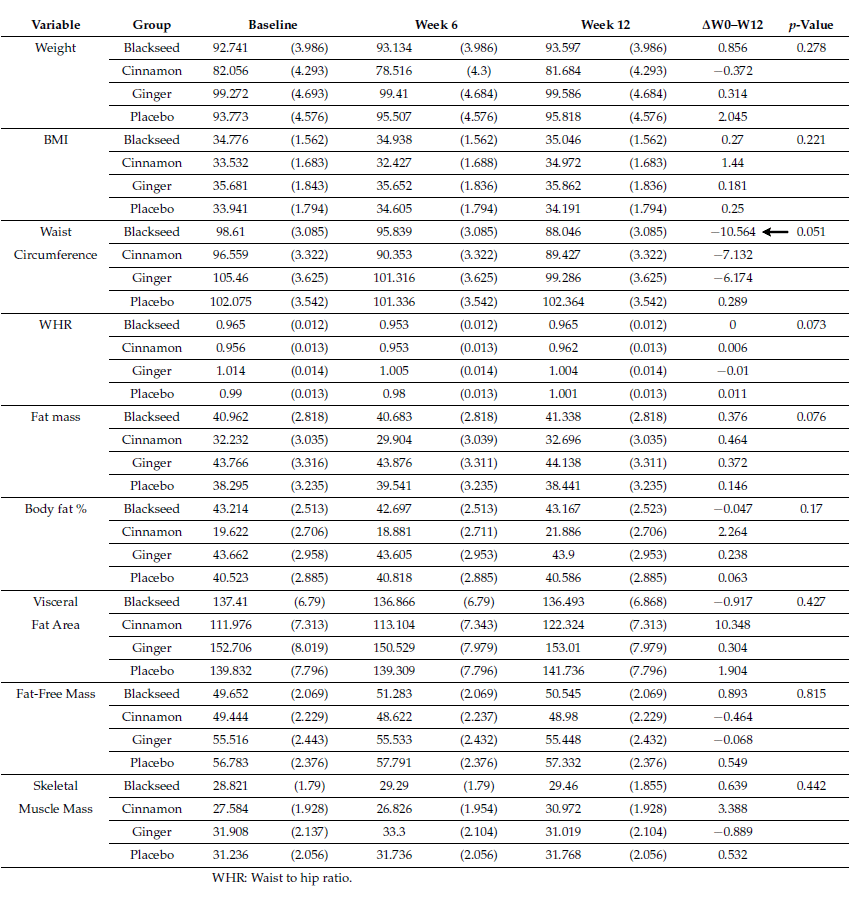 In the blackseed group, the researchers also saw a not entirely significant decrease in the size of the drug. In the second table below you can see that the waist decreased by 11 centimeters.