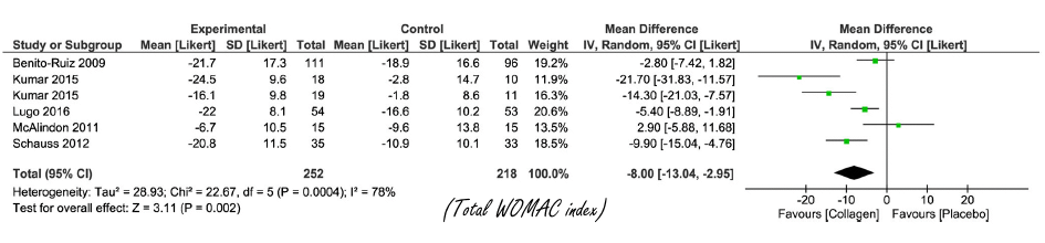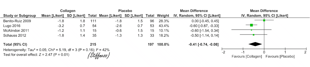 The WOMAC questionnaire looks at multiple aspects. Collagen supplementation significantly improved joint stiffness scores. You can see this above.