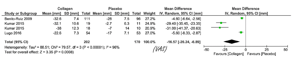 Another part of the questionnaire involves subjects having to indicate on a 10-centimeter line how much pain they have in the worn joint [VAS]. You can see below that supplementation reduced that pain by about 2 centimeters.