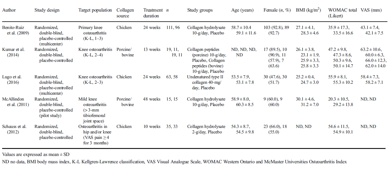 In 3 of the 5 trials, subjects were given hydrolyzed collagen, usually in a dose of 10 grams per day. In the remaining trials, subjects were given collagen in the form of peptides or undenatured type II collagen.