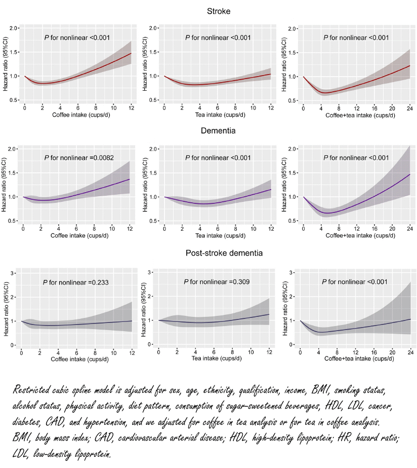 "Moreover, drinking coffee alone or in combination with tea was associated with lower risk of poststroke dementia."