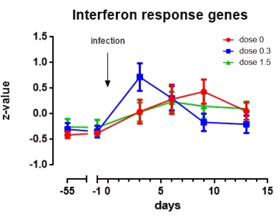 Interleukin-8 is a cytokine that mobilizes immune cells to fight infection. The expression of genes activated by interferon also increased more in the 300-milligram group than in the other groups.