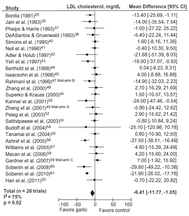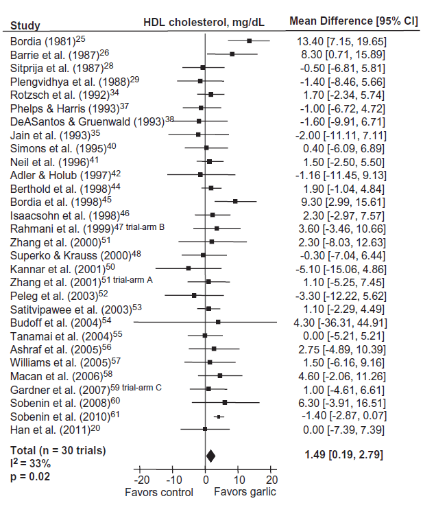 Garlic supplementation increased the concentration of 'good cholesterol' HDL by 1.5 milligrams per deciliter. This is positive, but an average increase of one and a half points is so modest that it has little to no effect on the risk of a heart attack.