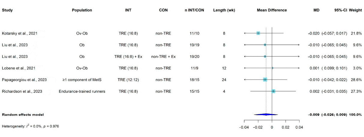 In the figure, Ex stands for exercise, INT for intervention, MD for mean difference, MetS for metabolic syndrome, Ob for obesity, Ov for overweight and TRE for time-restricted eating.