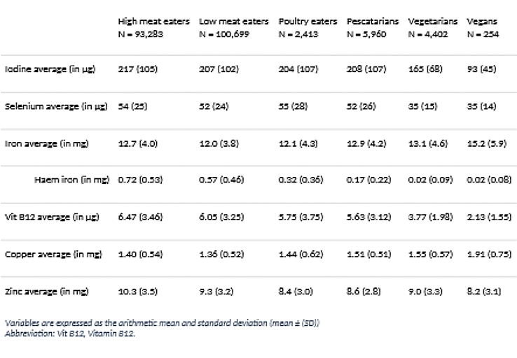 The table below - click on it for a larger version - that we found in the supplementary data section of the Austrian study shows that the average intake of selenium was too low in all groups. In the vegetarians and vegans it was even alarmingly low.