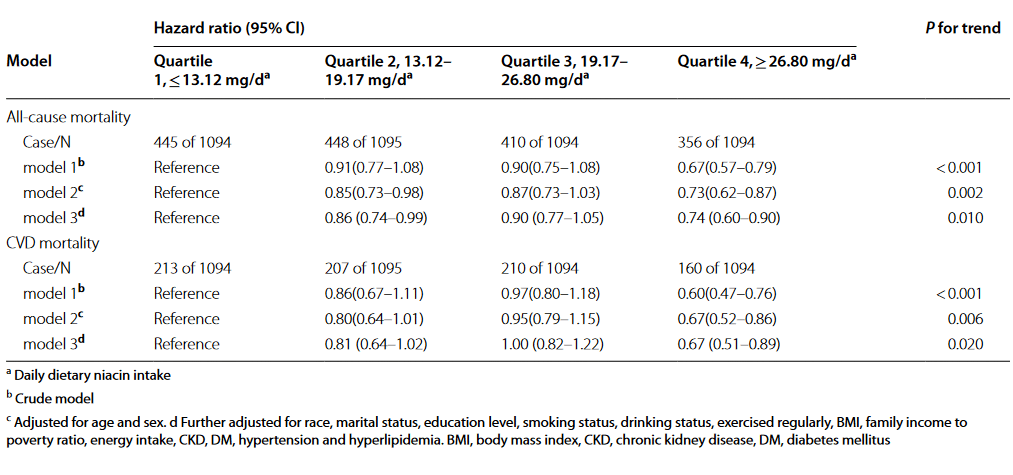 If heart patients consume a relatively large amount of vitamin B3 every day, their risk of death is lower than if their intake is on the low side. A high intake of vitamin B3 specifically reduces the risk of death from cardiovascular disease in this group.