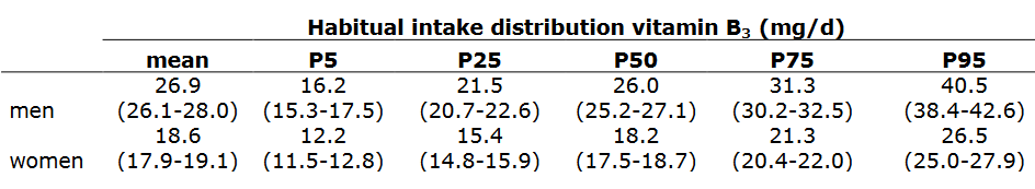 To give you an idea of how many people consume more than 26.9 milligrams of vitamin B3 per day, we consulted a memo from the Dutch research institute RIVM that we found on the web. It dates from 2018. [Link]