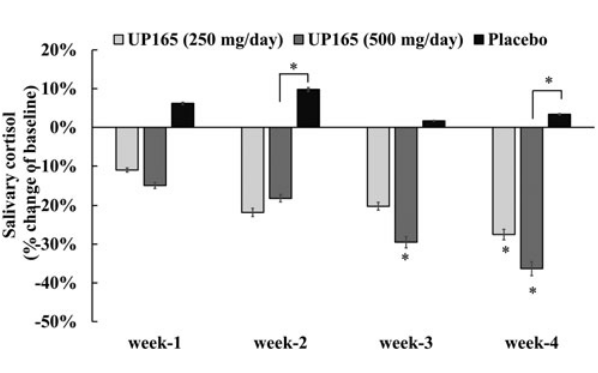 The most striking effect of supplementation was a 36.3 percent decrease in salivary cortisol concentration. That's quite substantial. The researchers didn't analyze blood samples, but the decrease in blood levels would have been similar.