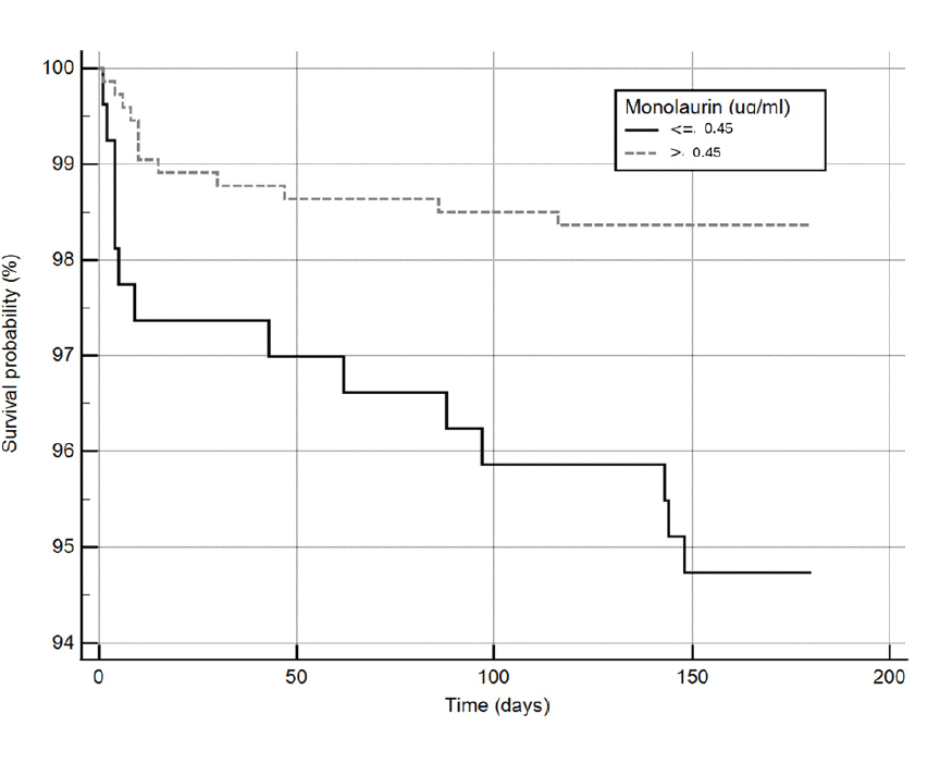 In the group with relatively little monalaurin in the blood, the risk of covid was more than a factor of 3 greater than in the group with relatively much monolaurin in the blood.