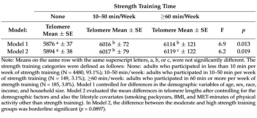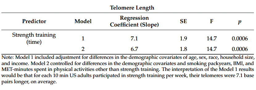 After Tucker had removed the effects of other factors as best he could, he found that the participants who did strength training had longer telomeres. The more minutes the participants did strength training each week, the longer their telomeres were.
