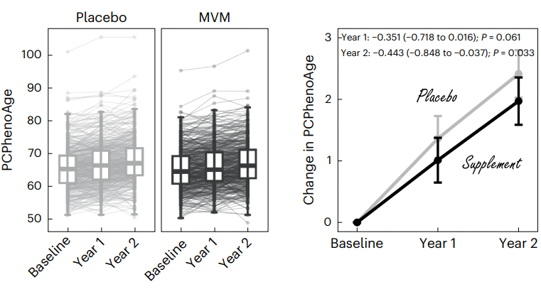 According to the PCPhenoAge, after two years of multivitamin supplementation, the subjects were roughly five months 'younger' than the subjects who had received a placebo for two years. Naturally, the researchers cannot say whether the subjects in the supplement group will actually remain 'young' for longer.