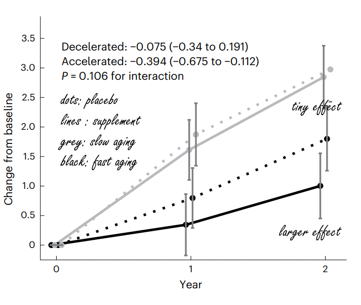 Two other markers, PCGrimAge and especially PCPhenoAge, did differ significantly between the placebo and supplement groups. These markers primarily indicate the likelihood of deteriorating health due to aging. They look at the methylation of genes involved in inflammation, the aging of the immune system, and the deteriorating glucose metabolism.