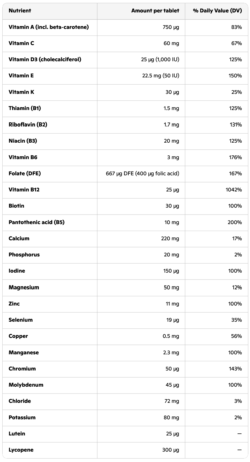 Cocoa supplementation had no effect in the study we are discussing today. So we won't be discussing that. Instead, we will discuss the effect of the multivitamin. That did have an effect. You can see the composition of the supplement below. Click on the table for a larger version.