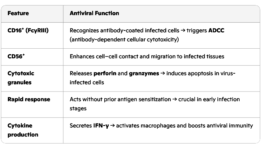 Most CD16+ natural killer cells are CD16+ and CD56+ natural killer cells. Below, we summarize the key characteristics of this cell type. Essentially, these cells become active in the initial stages of a viral infection or the development of cancer. These natural killer cells kill off defective or infected cells.