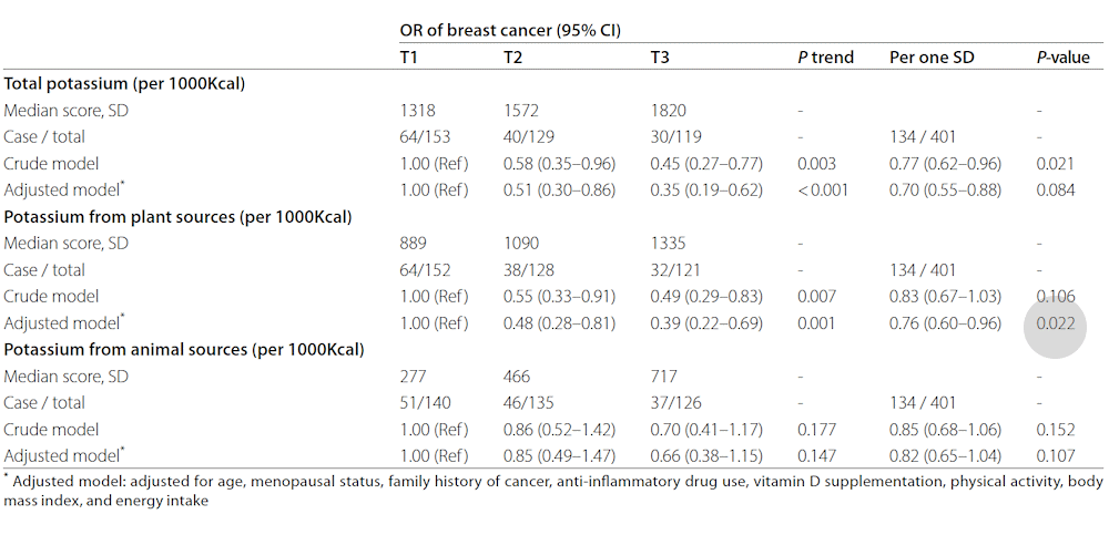 Only potassium from plant sources protected against breast cancer. The risk of breast cancer in women who consumed approximately 1,340 milligrams of potassium per 1,000 kilocalories was 60 percent smaller than in women who consumed approximately 890 milligrams of potassium per 1,000 kilocalories.
