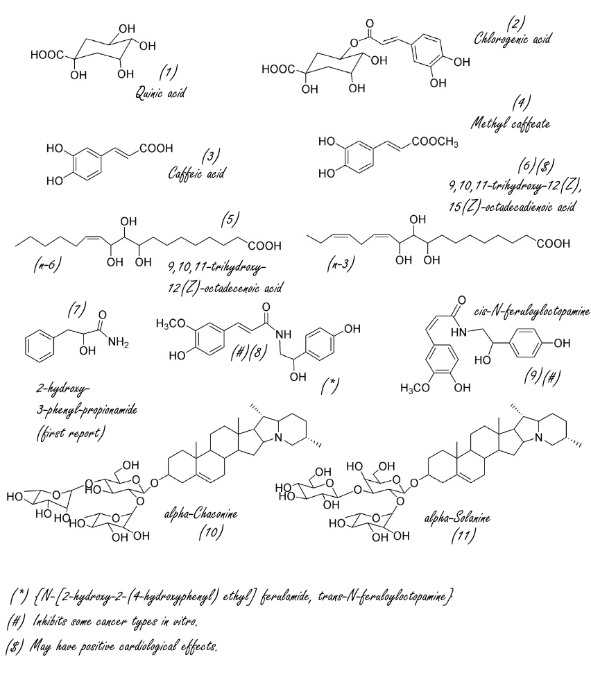Some components of both potato peels and potatoes, such as caffeic acid and chlorogenic acid, were able to eliminate free radicals in test tubes. In the form of an extract from peeled potatoes, the joint antioxidant effect of all those substances together was about the same as vitamin C. However, the antioxidant effect of an extract from potato peel was better.