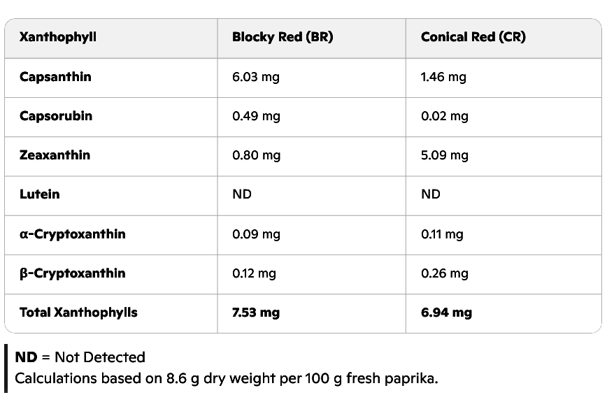 The table below shows how much xanthophyll the Koreans found in 100 grams of fresh red bell pepper [Blocky Red] and 100 grams of fresh red pointed bell pepper [Conical Red].