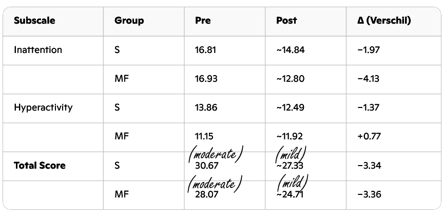 Because the average participant in this pilot study initially had a score of 28-31, the scores in both groups dropped below 28. And that, coincidentally, is precisely the cutoff point where moderate ADHD transitions to mild.