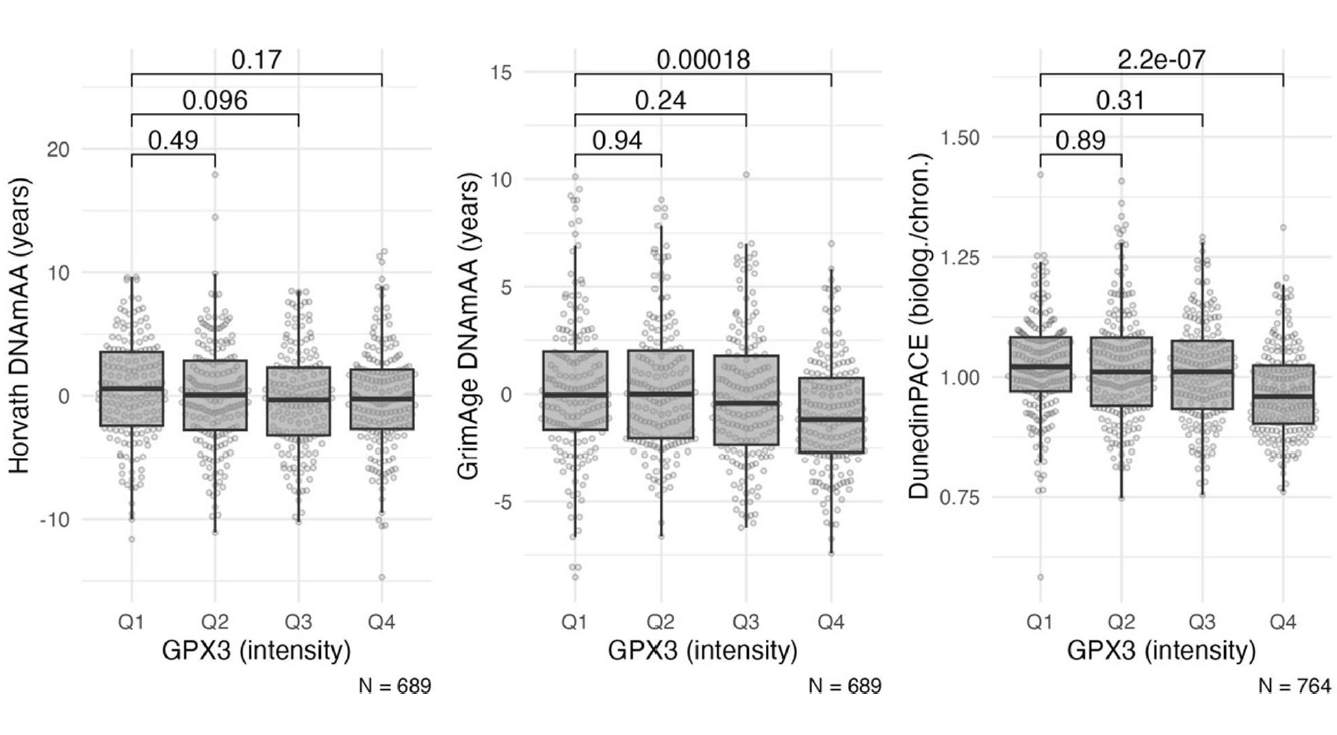 The figure below shows that a higher GPX3 concentration is associated with slower aging according to the DunedinPace epigenetic clock—not according to other clocks. Click on it for a larger version.