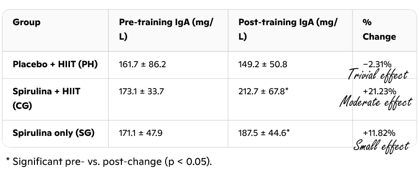 "The data in the present study demonstrated the effectiveness of spirulina supplementation and HIIT concurrently in making significant changes in IgA concentrations [...]", the researchers summarize.