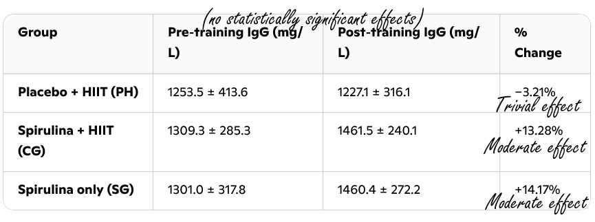 Spirulina supplementation increased the concentration of IgA antibodies. This increase was statistically significant. Moreover, the increase was substantially greater in the group that used spirulina and also exercised. This may mean that intensive physical exercise and supplementation reinforce each other's effects.