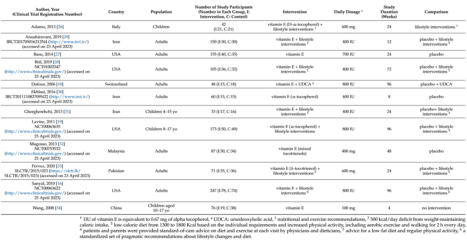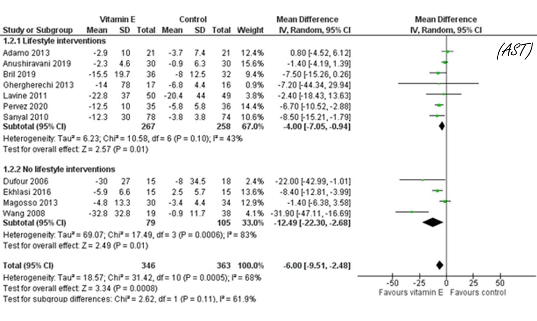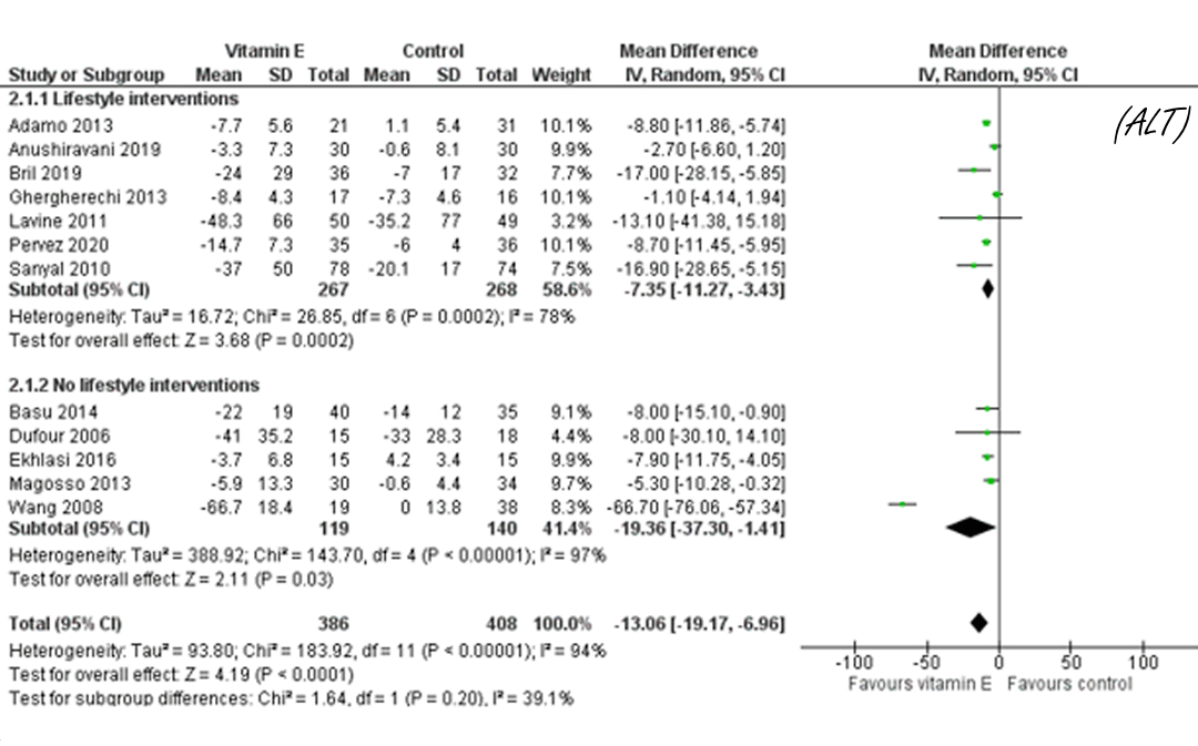 In some studies, researchers studied the effect of vitamin E supplementation in conjunction with an improvement in lifestyle. As you can see, vitamin E lowered liver values both in combination with an improvement in lifestyle and without lifestyle modification.