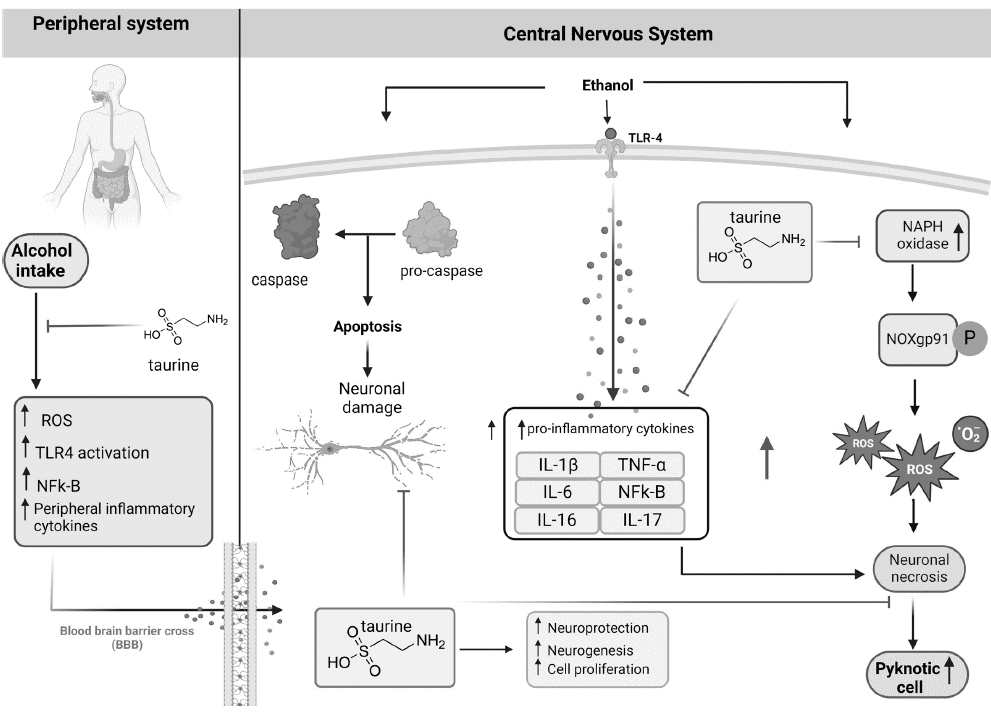 The researchers conducted a literature study into possible mechanisms that can explain how taurine mitigates the negative effects of alcohol on brain cells. Perhaps we should look for the explanation in the antioxidant effect of taurine, perhaps in the ability of taurine to inhibit inflammation.