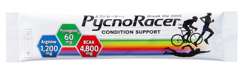 PycnoRacer is a powder, packed in sachets. A recommended daily intake of 2 sachets contains 60 milligrams of Pycogenol, 10 milligrams of Robuvit, 4800 milligrams of BCAAs and 1200 milligrams of arginine.