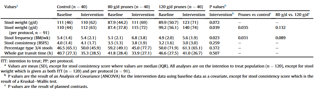 The addition of 80 grams of dried plums to the diet increased the amount of solid stool per day by 22 grams per day. A daily portion of 120 grams of dried plums resulted in an increase of 33 grams.