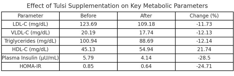 In the tulsi group, supplementation with tulsi appeared to reduce the concentration of 'bad cholesterol' LDL and VLDL and to increase that of 'good cholesterol' HDL. This means that the risk of cardiovascular disease is reduced.