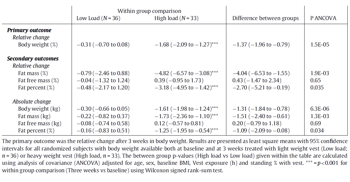 In 2020, Swedish researchers from the University of Gothenburg published a small human study involving 69 obese subjects with a BMI of 30-35. The subjects wore a weighted vest for at least 8 hours per day for 3 weeks. To be precise, the subjects wore an RF Weightvest from the Swedish Casall.