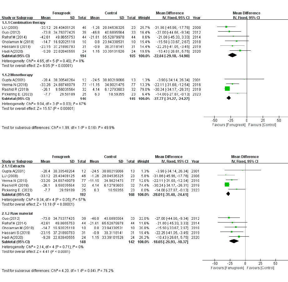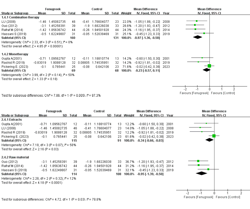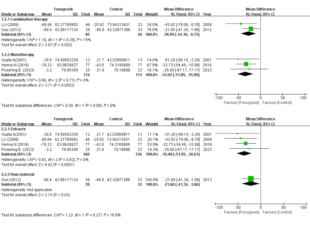 In a number of trials, the researchers studied the effect of fenugreek alone, in others the added value of fenugreek in combination with other interventions, such as medication or exercise.