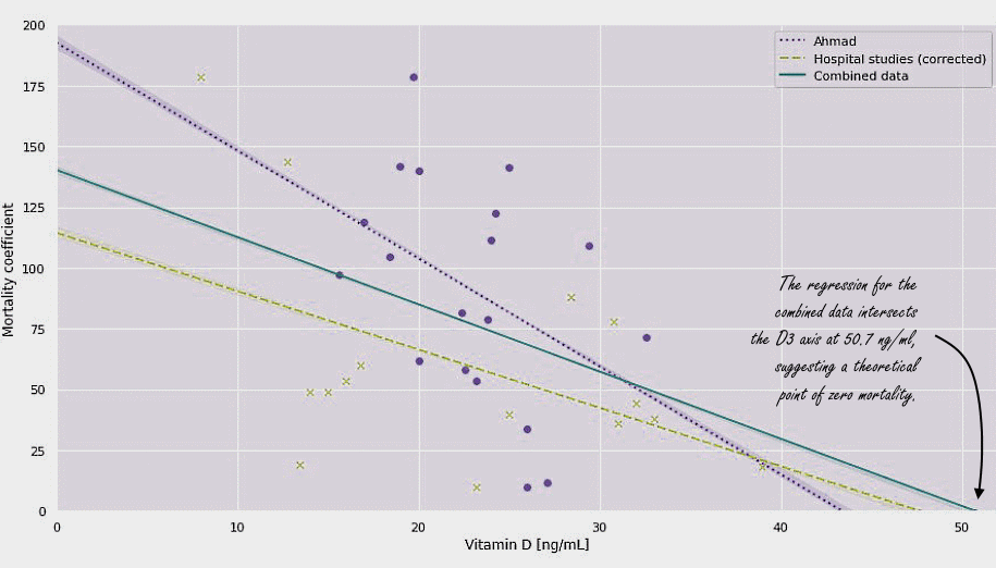 When the researchers aggregated the results of all that study, they were able to use statistics to calculate at which concentration of vitamin D3 the risk of death if infected with SAR-CoV2 could in theory be minimal. That was, they were able to find out, at a level of just over 50 nanograms per milliliter.