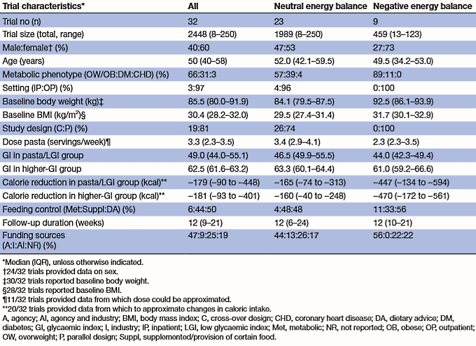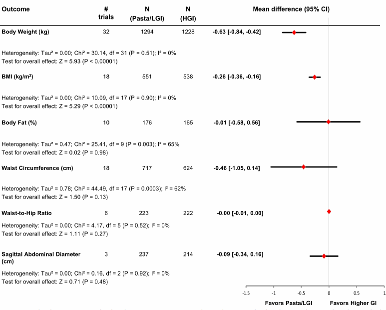 The researchers collected 32 trials, in which test subjects ate pasta 3 times a week for an average of 12 weeks. Pasta has a low glycemic index, and the trials were designed to compare the effects of a diet with a low glycemic index with that of a diet with a high glycemic index.