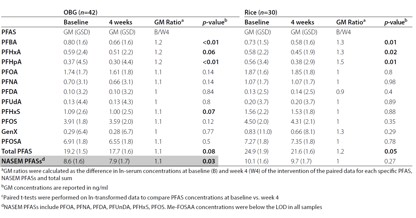 The concentration of NASEM PFASs decreased by a statistically significant 8 percent in the experimental group [OBG]. There was no significant decrease in the control group [RICE].