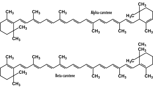 But in the last decades of the twentieth it has become increasingly clear that vegetables contain not only vitamins, but also all kinds of other important bioactive substances. For example, carrots and spinach also provide alpha and beta-carotene, two closely related and prominent carotenoids. [Structural formulas]