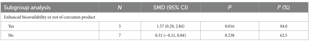 In 5 of the 9 trials, subjects were given supplements designed to increase the absorption of curcumin. In those trials, subjects were given products containing Theracurmin, BCM-95, Curcumin-Galactomannan Complex, Longvida, and a combination of curcumin and piperine.