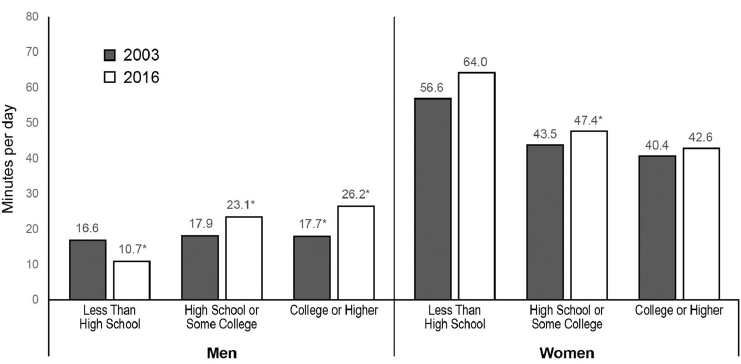 The number of minutes per day that Americans spent on home-cooking increased as well. Especially educated men are spending more time preparing meals. However, less educated men are spending less time in the kitchen.