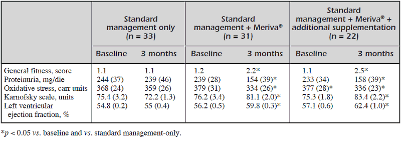 In addition to curcumin, the third group of subjects also used 800 IU of vitamin D3, 500 milligrams of vitamin C, 3 grams of L-isoleucine and 1 gram of L-carnitine every day. [Standard management + Meriva + additional supplementation]