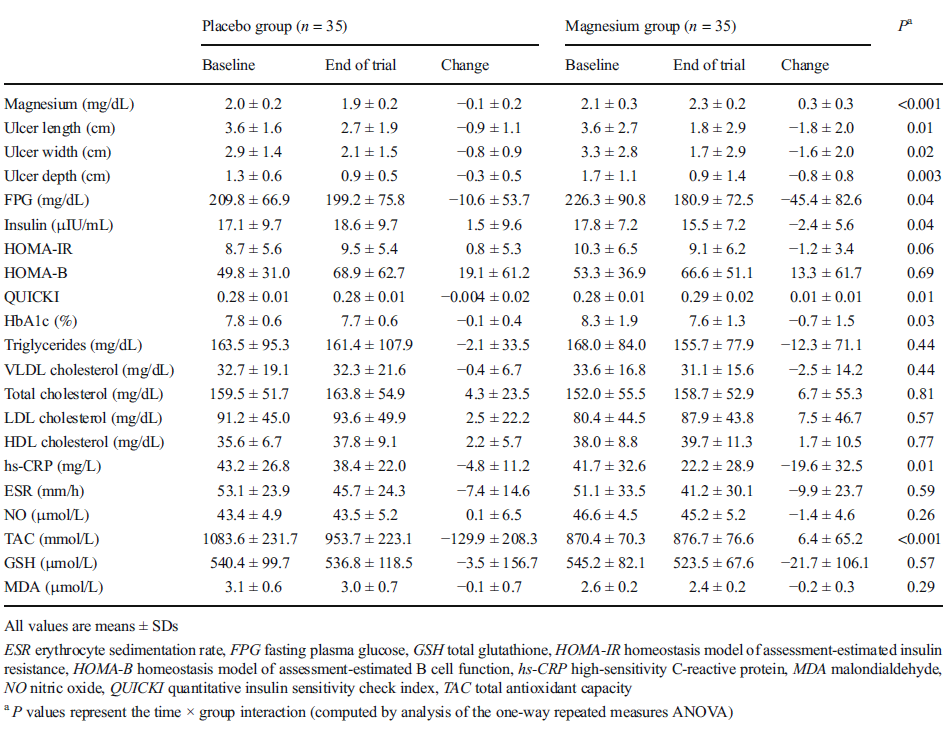 Regardless of the outcome of this inquiry, there are indications that magnesium does play a role in the healing of diabetic foot ulcers. In epidemiological studies, researchers find a lower concentration of magnesium in the blood of patients with foot ulcers. [Pak J Med Sci. 2013 Nov;29(6):1329-33.] [Arch Med Res. 2001 Jul-Aug;32(4):300-3.]