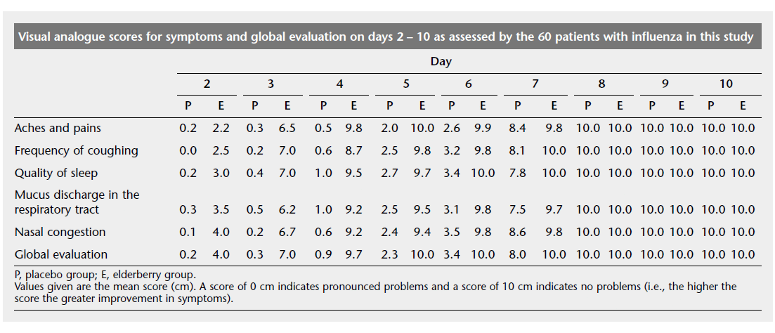 Supplementation with liquid elderberry extract improved almost all aspects of flu, as shown in the table above. Click on it for a larger version. Pain, coughing, poor sleep, nasal congestion - in the experimental group it disappeared faster.
