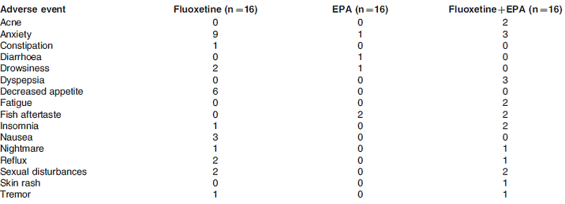Although the actions of ethyl EPA and fluoxetine were similar, their side effects were not. EPA had hardly any side effects, fluoxetine had quite a few.