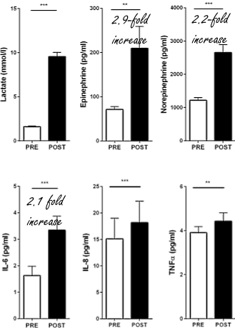 The concentrations of adrenalin, noradrenalin and interleukine-6 [Il-6] were much higher in the blood that had been taken just after the workout. In addition, the researchers also observed that the concentrations of interleukine-8 [Il-8] and TNF-alpha were also higher.