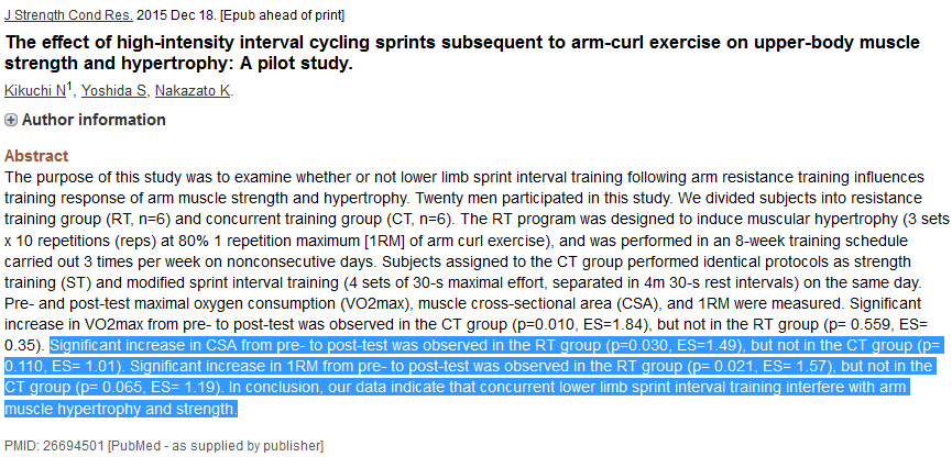 Both groups developed bigger biceps. The only difference was that the effect was not quite statistically significant in the interval training + strength training group, and just statistically significant in the strength training group. Given the size of the sample, this doesn't tell us much.