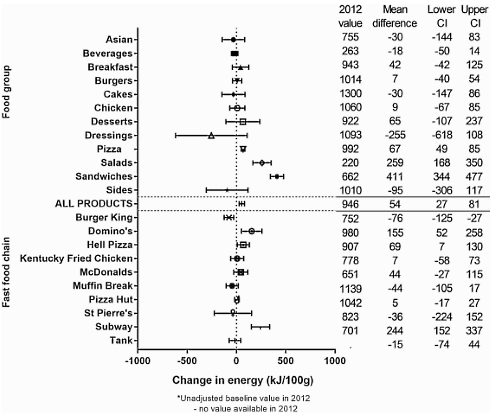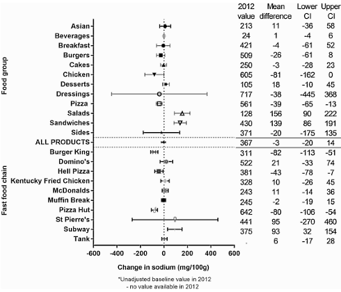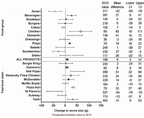 For sodium the situation was slightly more nuanced. The fast food chains had reduced the composition of a number of products. As a result, the amount of sodium per gram of fast food did not increase, and there was even a tendency to decrease. [Figure] But because the portion size increased, in 2016 a serving yielded 11 percent more sodium than in 2012.
