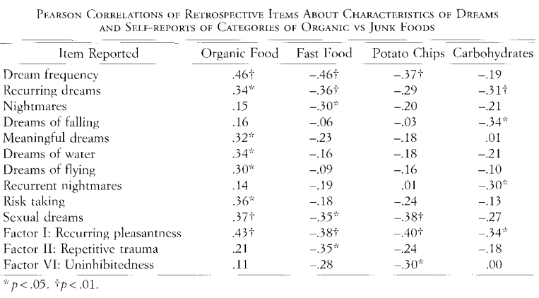 The students in the first category ate more fruit and vegetables, mostly organically grown. They were more likely to have recurring dreams, more likely to have meaningful dreams, and more often to dream about risky ventures, sex, water, and flying.