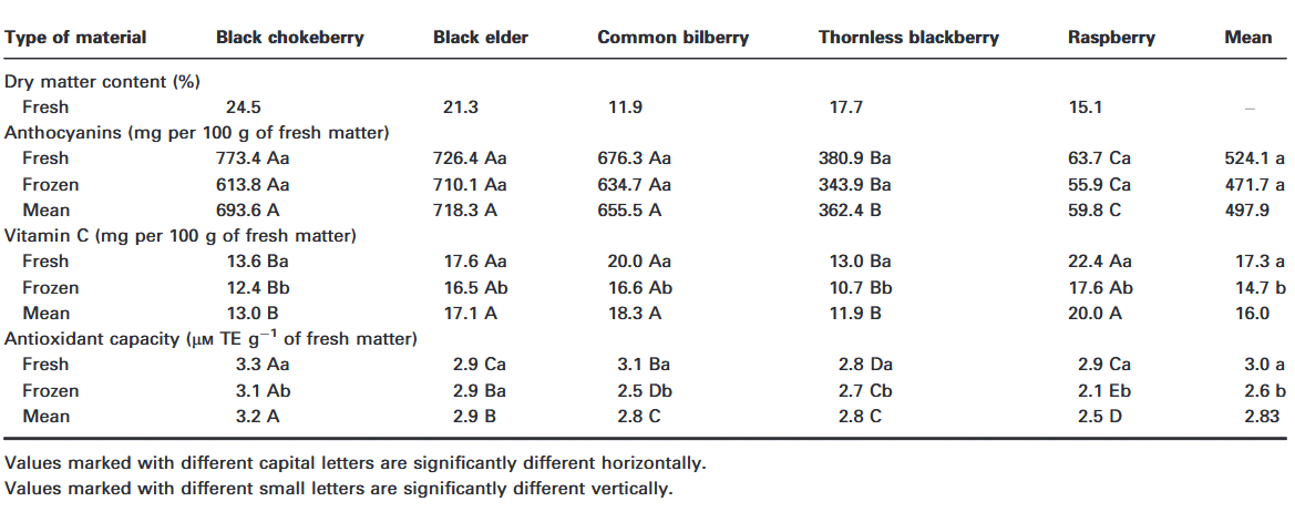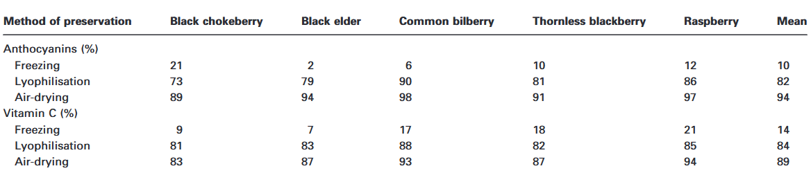 The table below shows what percentage of the anthocyanins and vitamin C in berries is lost through drying, freezing and lyophilization.